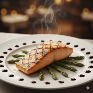 ตัวอย่าง: แซลมอนชิ้นใหญ่ย่างวางเป็นจุดเด่น ล้อมรอบด้วยหน่อไม้ฝรั่งเรียวเล็กและซอสที่หยดเป็นจุดๆ