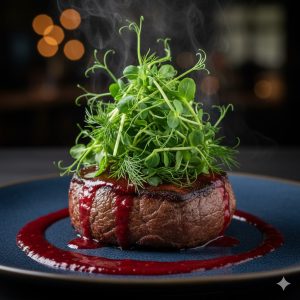 ตัวอย่าง: สเต๊กเนื้อสีน้ำตาลเข้มกับซอสเบอร์รี่สีแดงสด และผักโรยสีเขียวสดใส